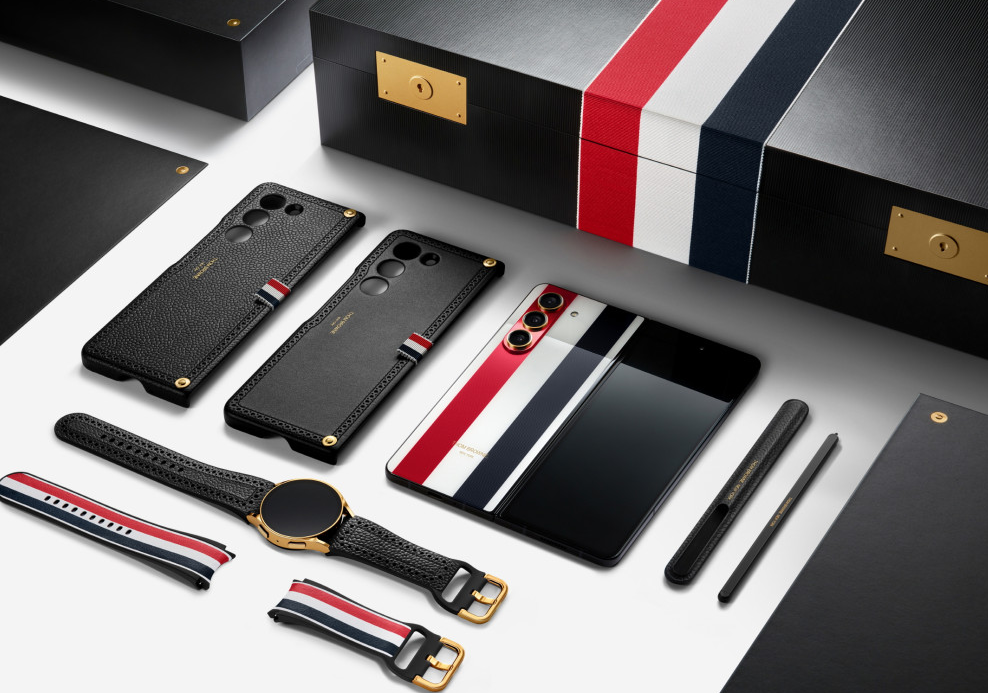 톰브라운 브랜드 디자인의 서류가방 박스에 빨간색, 힌색, 파란색, 시그니처 패턴이 모든 구성품 곳곳에 고급스럽게 표현 갤럭시 Z 폴드5 후면은 3색 시그니처 패턴과 패브릭 질감으로 표현